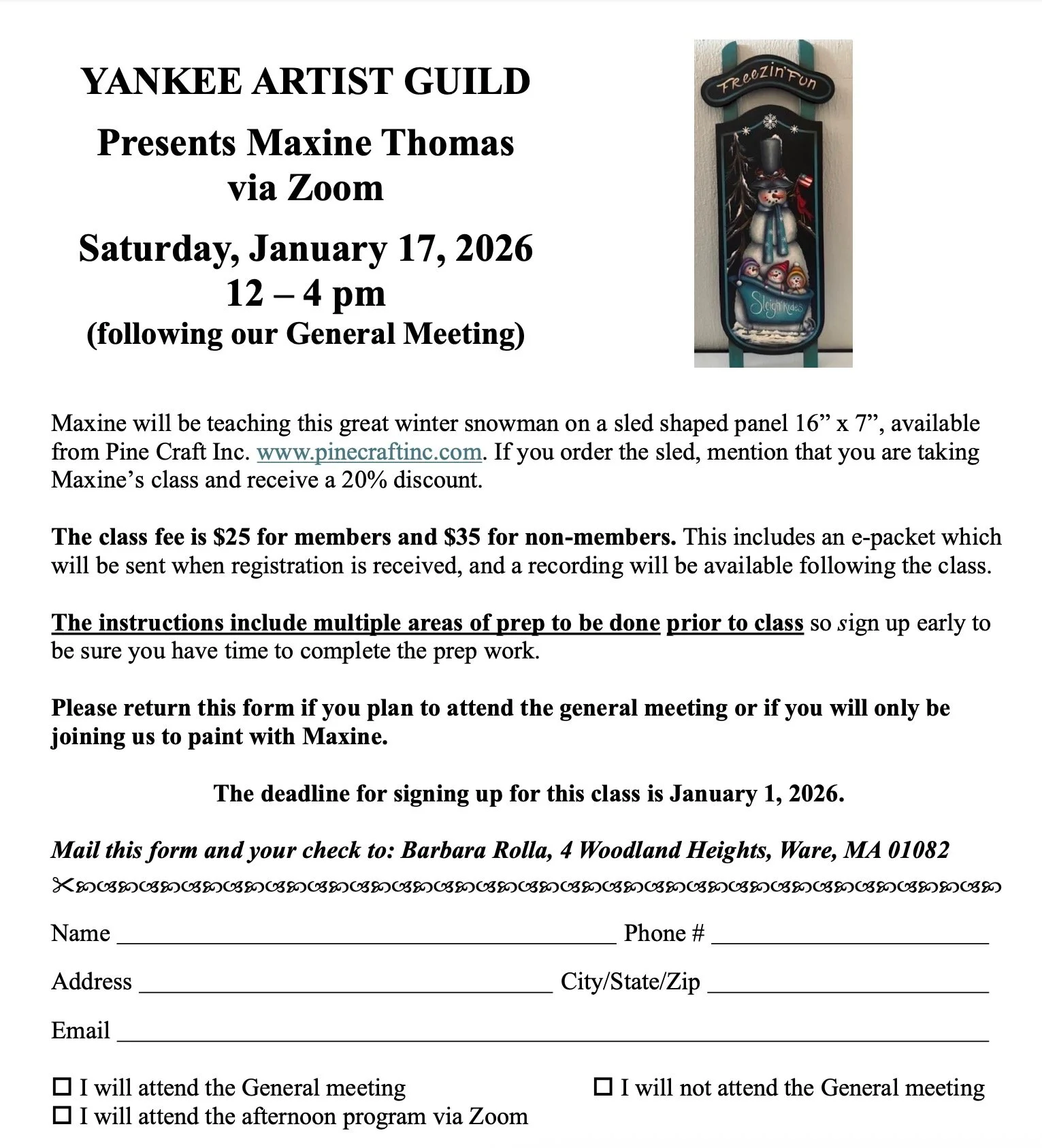 Yankee Artist Guild presents Maxine Thomas via ZOOM Saturday, January 17, 2026 12:00 PM 4:00 PM 12:00 16:00 Google Calendar ICS Maxine Thomas will be teaching this great winter snowman sled.